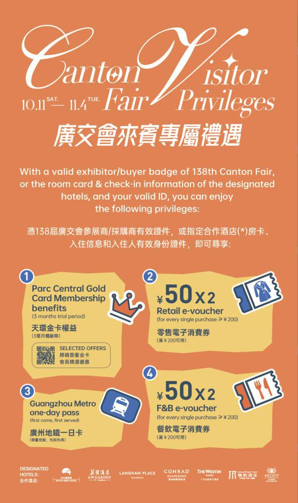 位于天河路的天環Parc Central近期升级了广交会专属礼遇。即日起至11月4日,凭广交会有效证件可至商场B2层礼宾处领取价值超2000元的礼包,含广州地铁一日票、餐饮消费券等实用权益。